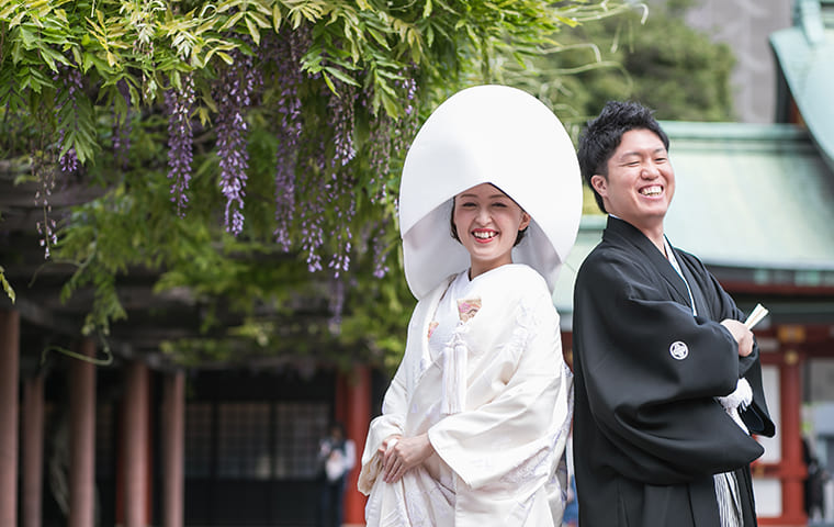 式場探しをするため色々な式場を見学しましたが、赤と緑の社殿と青い空のコントラストが美しい日枝神社と、