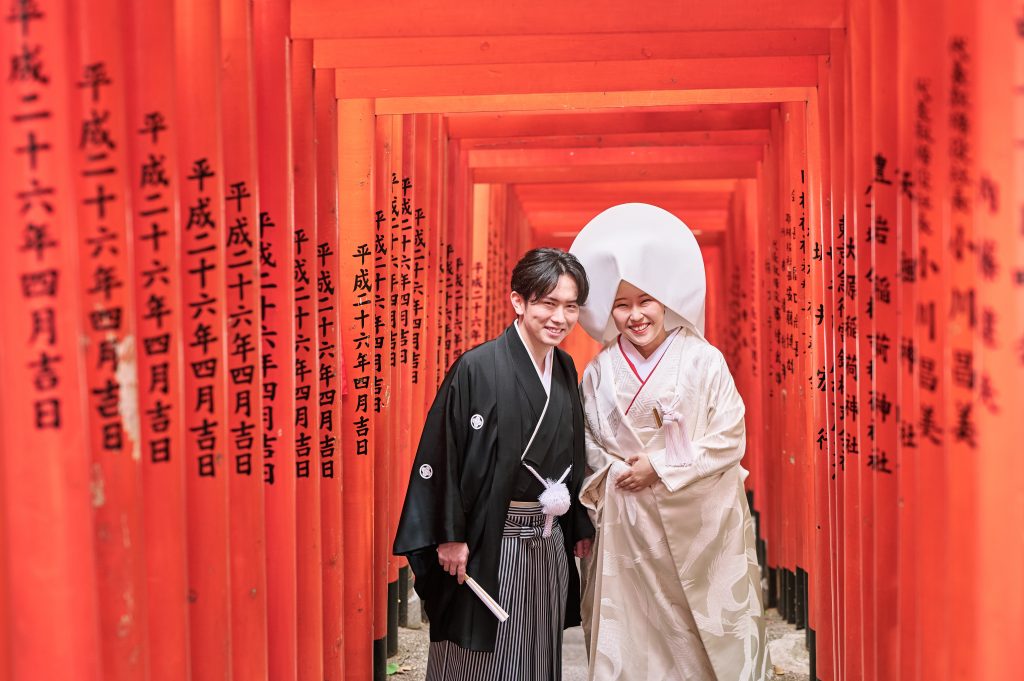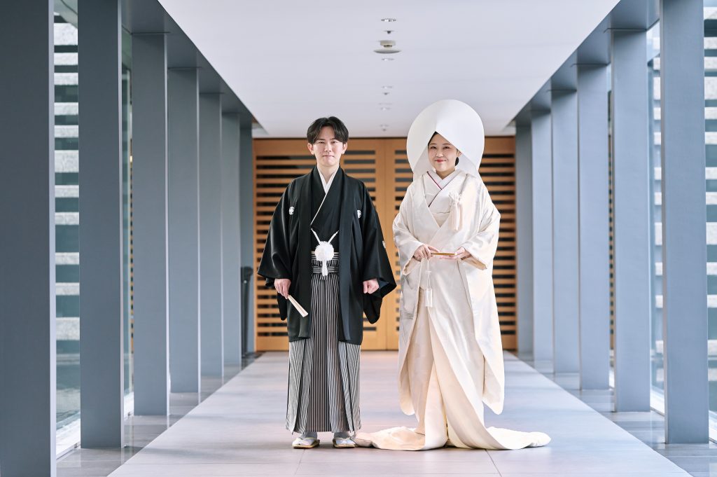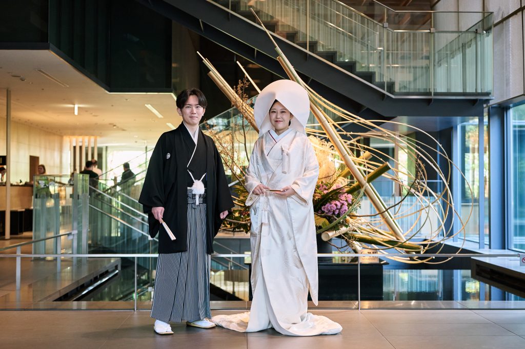 プログラム内容と全体の雰囲気です。プログラムに関しては、神前式だったため再入場でバージンロード風の演出を行ったり、ゲスト・親族全員に等しく感謝を伝えるために全員へ手書きの手紙を書き、読んでもらう時間を設けたりしました。雰囲気に関しては、和装と洋装の両方に合う会場装花を作っていただきました。フウセントウワタなど少し変わった花を使ってモダンな雰囲気を出しつつ、和装にも合うように苔や岩も使ったかっこいい装花にしていただいて、大満足でした。装花に合わせて和装ではヘアアレンジにカラーの花を挿し、垂れ下がった花を使ったブーケに合わせてイヤリングは長さのあるものにしました。
