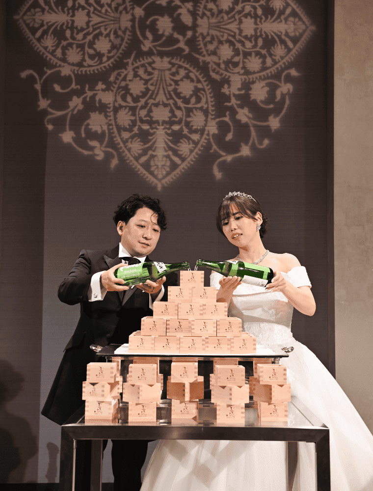 プランナーの方もたくさんプラン提案をしてくださり、新郎が甘いものが苦手なのでウェディングケーキの代わりに日本酒の升タワーを行いました。