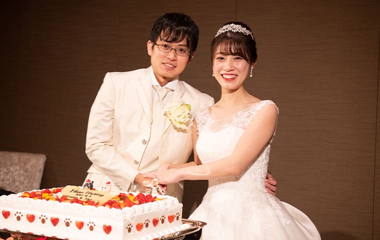会場でのお食事は和洋折衷コースの「奏」を選びました。繊細で上質、そしてこの上なく美味しいお料理を気軽にお箸で頂けるという点が、わたしたちが求めるアットホームな結婚式の雰囲気を作れたポイントになったかと思います。参列者からは「料理がとても美味しかった」と好評でした。ウェディングケーキはオリジナルでデザインをさせてもらい、大好きな愛犬を飾ってもらいました。ギリギリまで微調整して下さり、細かいワガママを全て叶えてもらい、想像以上に華やかで可愛らしいものに仕上がり感動しました。